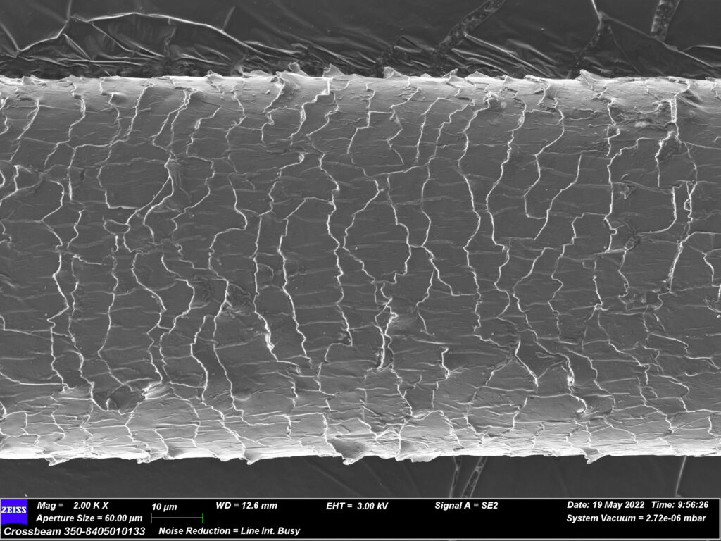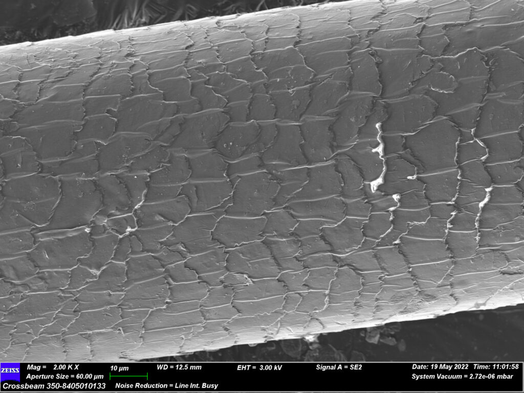 BESCHÄDIGTES HAAR, DAS ANSCHLIEßEND MIT 24 KERATS® BEHANDELT WURDE (versiegelte und glänzende Kutikula)