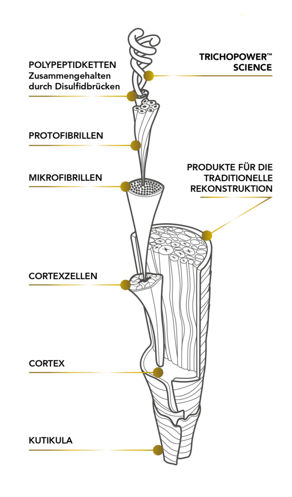 TRICHOPOWERTM SCIENCE ist eine wertvolle Quelle von 24 Aminopeptiden (abgeleitet von einem biomimetischen Peptid und hydrolysierten pflanzlichen Proteinen), die synergistisch wirken, um die Keratinketten des Haares tiefgehend zu reparieren.